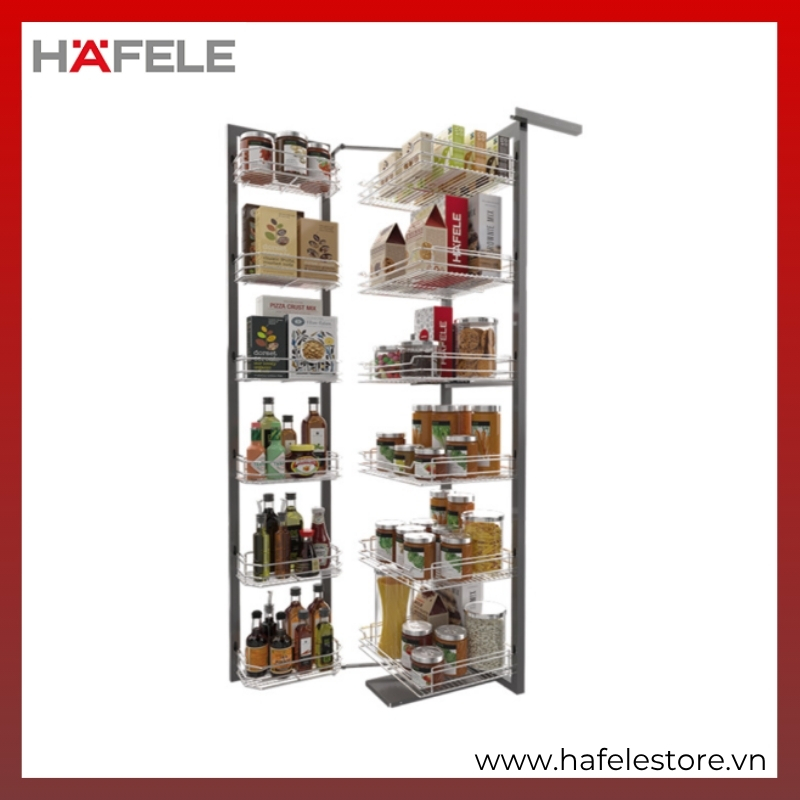 - Thiết kế tối ưu không gian: Giải pháp lưu trữ lý tưởng cho tủ kho cao, tận dụng toàn bộ chiều cao tủ để chứa thực phẩm, gia vị, chai lọ và vật dụng bếp.